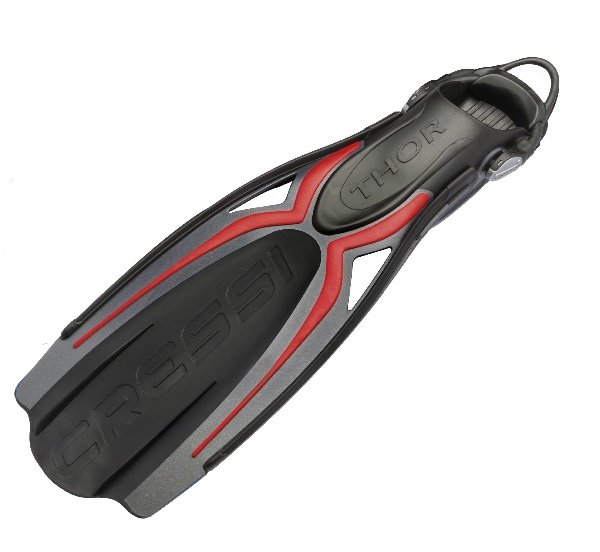 Thor disfrurta del exclusivo sistema de inyección de 3 materiales patentado por Cressi, que proporciona una excelente combinación de resistencia, potencia, confort y estética y la optimización de los requerimientos de cada zona de la aleta: