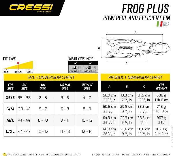 Frog Plus está fabricada en una nueva variante de polipropileno de bajo módulo que, unido a una particular estructura, combina una gran flexibilidad, suavidad y resistencia a un uso exigente (incluso como aleta de alquiler y escuela en un centro de buceo), durabilidad y una estética inéditas en aletas proyectadas con esta filosofía. Frog Plus es la auténtica 4x4 de las aletas Cressi.